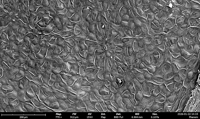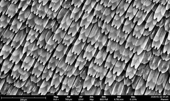 I also got trained recently on the Thermofisher Phenom XL SEM in the Breakerspace, and took photos of a butterfly wing and hydrangeas. I’m particularly interested in the forms of organic structures, which are difficult to image using SEM as it relies on samples to be dry and conductive to function. Consequently, I ensured my samples were fully desiccated beforehand, then carried out a gold sputtering process. I also had to be particularly careful when mounting my samples, as the SEM is very sensitive to particulate matter, with dust able to damage the instrument. The butterfly sample in particular was a concern as the scales can break very easily. I used a lot of compressed air to ensure the sample was clean (and definitely damaged the wing in the process), but I got great results!