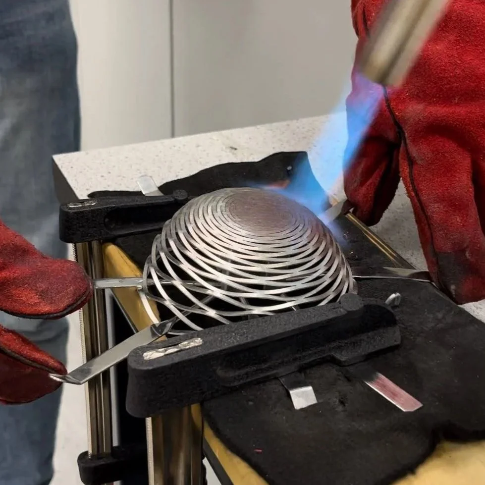 I prototyped the domes out of card, stainless steel and aluminum. The cuts were made using a universal laser cutter and a Rofin laser cutter. I also CNC milled an aluminum model, but ultimately decided against that manufacturing method because of the endmill’s role in removing material and limiting the dimensions of the dome segments.
