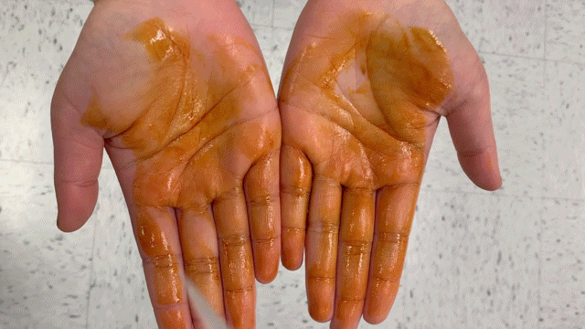 One component contains povidone-iodine, a common wound disinfectant, with strong color. The staining from the Povidone-iodine allows users to ensure total hand coverage, while also providing antiseptic properties.
